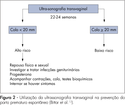 Com base nos resultados de nosso estudo, no qual foram avaliadas 1.958 gestantes, aquelas com comprimento do colo igual ou superior a 20 mm têm baixo risco para o parto prematuro espontâneo. Por outro lado, aquelas com comprimento menor do que 20 mm devem ser consideradas de maior risco e necessitam de maiores cuidados (Figura 2).